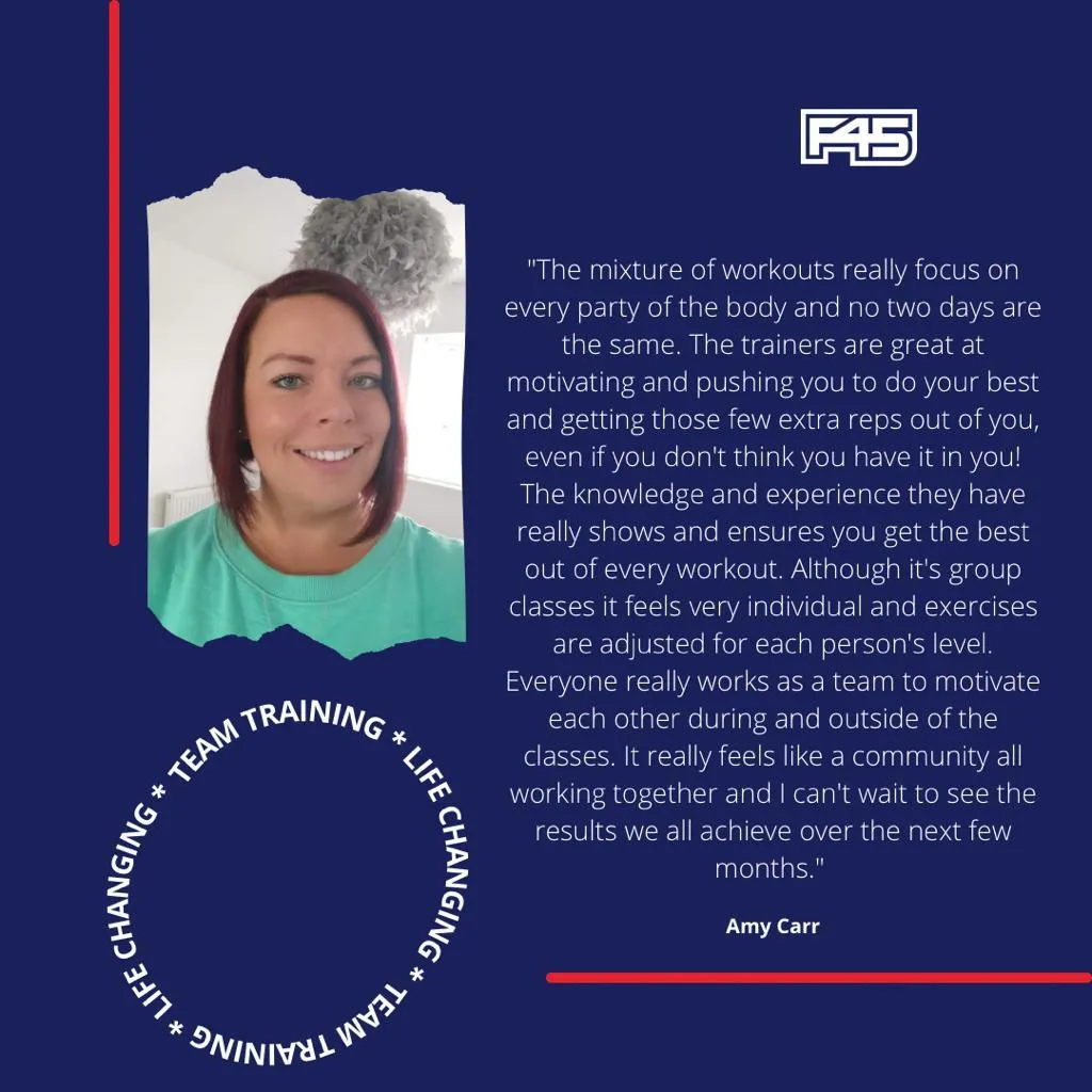 F45 stands for 'Functional 45 minute' HIIT workouts. Our classes are a mix of cardio and strength based workouts geared towards every day movement.